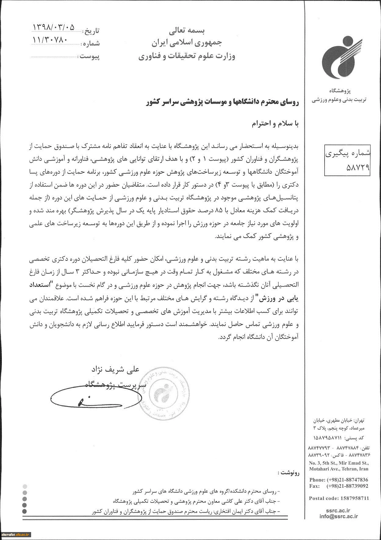 قابل توجه اعضای محترم هیات علمی برگزاری دوره پسا دکتری پژوهشگاه تربیت بدنی و علوم ورزشی با همکاری صندوق حمایت از فناوران و پژوهشگران کشور 2
