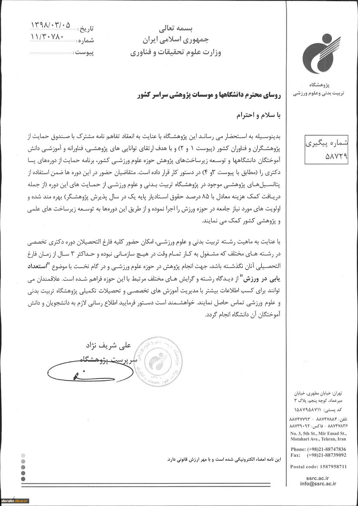 برگزاری دوره پسا دکتری پژوهشگاه تربیت بدنی و علوم ورزشی با همکاری صندوق حمایت از فناوران و پژوهشگران کشور 2