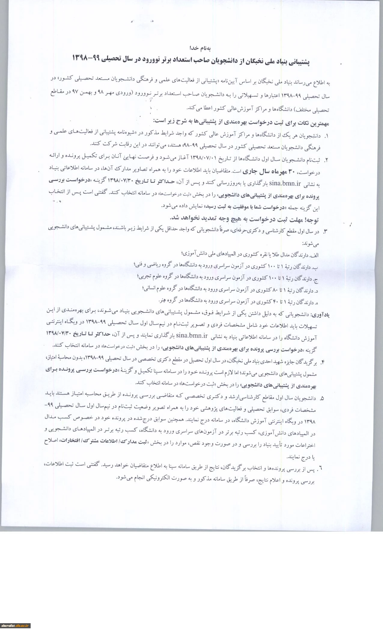 فراخوان ثبت نام دانشجویان جدیدالورود جهت بهره مندی از تسهیلات دانشجویی بنیاد در سال 99-1398 2
