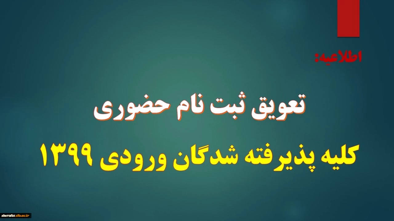 امتیاز دهید : قابل توجه کلیه پذیرفته شدگان سال 1399 تعویق ثبت نام حضوری 2 سهشنبه 27 آبان 1399 ساعت 14:44