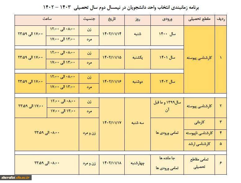 برنامه ی زمانبندی انتخاب واحد دانشجویان در نیمسال تحصیلی 1402-1403